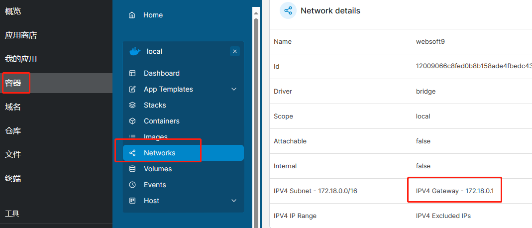 docker network inspect bridge | grep Gateway查看 - 打开 Websoft9 控制台,通过:容器 > Networks,查看 websoft9 网络的 IPV4 Gateway