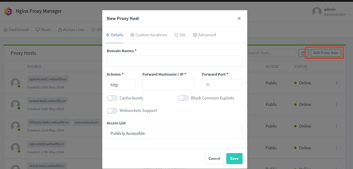 点击 Add Proxy Host,新建 HTTP 转发